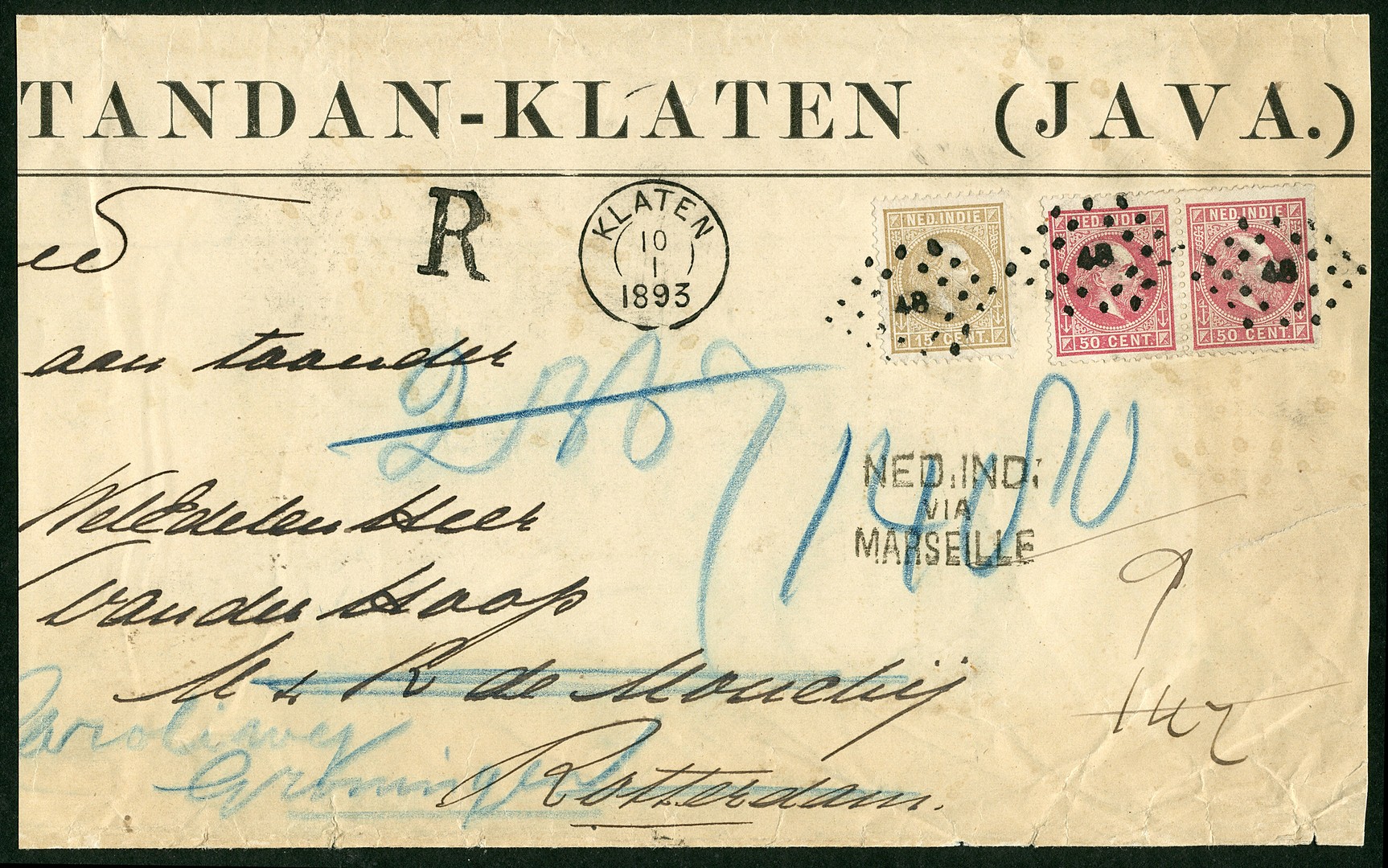 15 Cent en 50c in paar nrs. 11 en 15 op groot briefdeel van Klaten 10-1-1893 aangetekend over Semarang en Weltevreden naar Rotterdam en verder naar Groningen 12-2. Het stuk moet van de 7e gew.kl. zijn geweest (90-105 gr. = 105c + 10c R-recht = 115c)