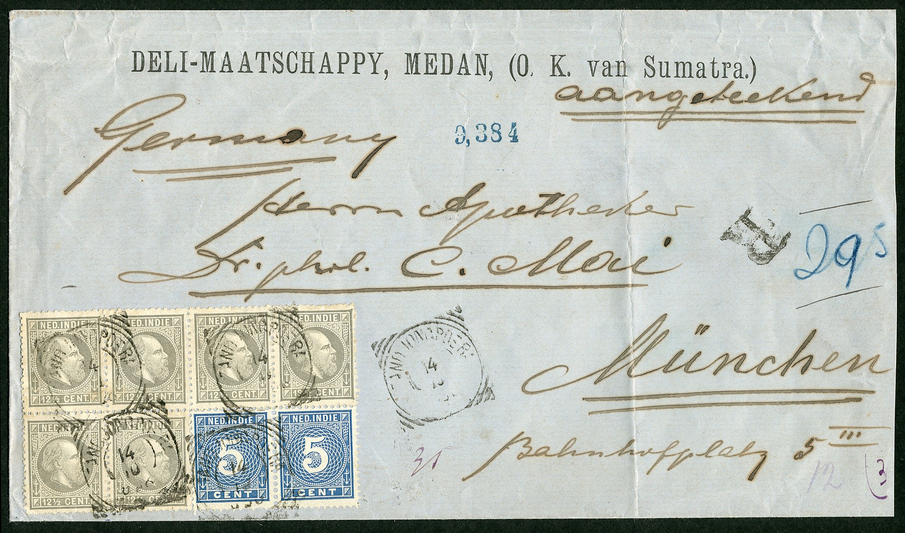 12½ Cent nr. 10 in mooie strip van vier en prachtpaar, tevens 5c nr. 22 in prachtpaar op firmacouvert (vouw) van de 3e gew.kl. van Tandjongpoera 14-10-1896 aangetekend over Medan en de N.I.Agent Singapore naar Muenchen 12-11. Schaars en correct tarief, attractief stuk!