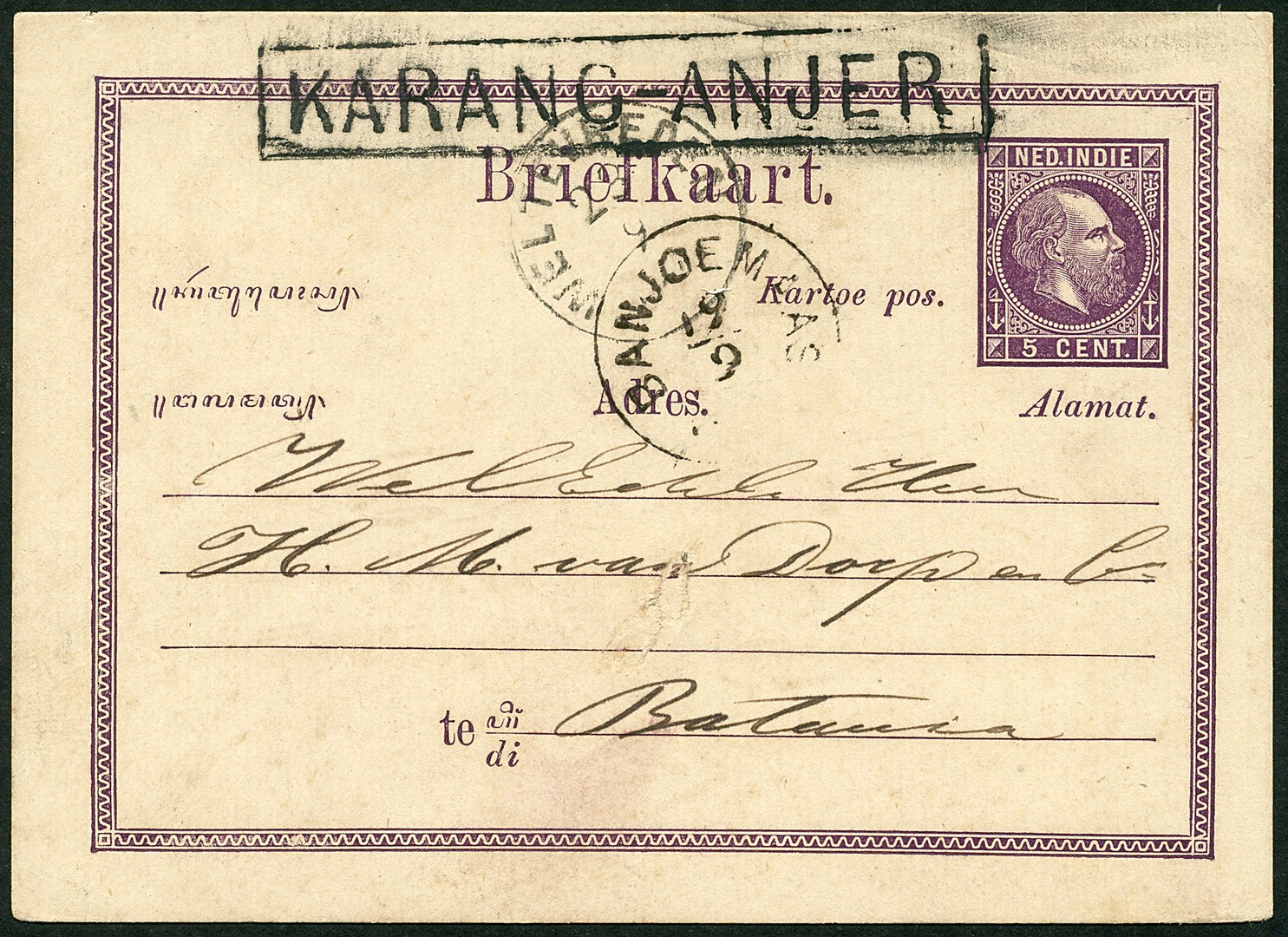 Naamstempels DJAWANA en KARANG-ANJER in kader in zwart op twee bk. van 5c uit juli 1877 resp. sep 1876