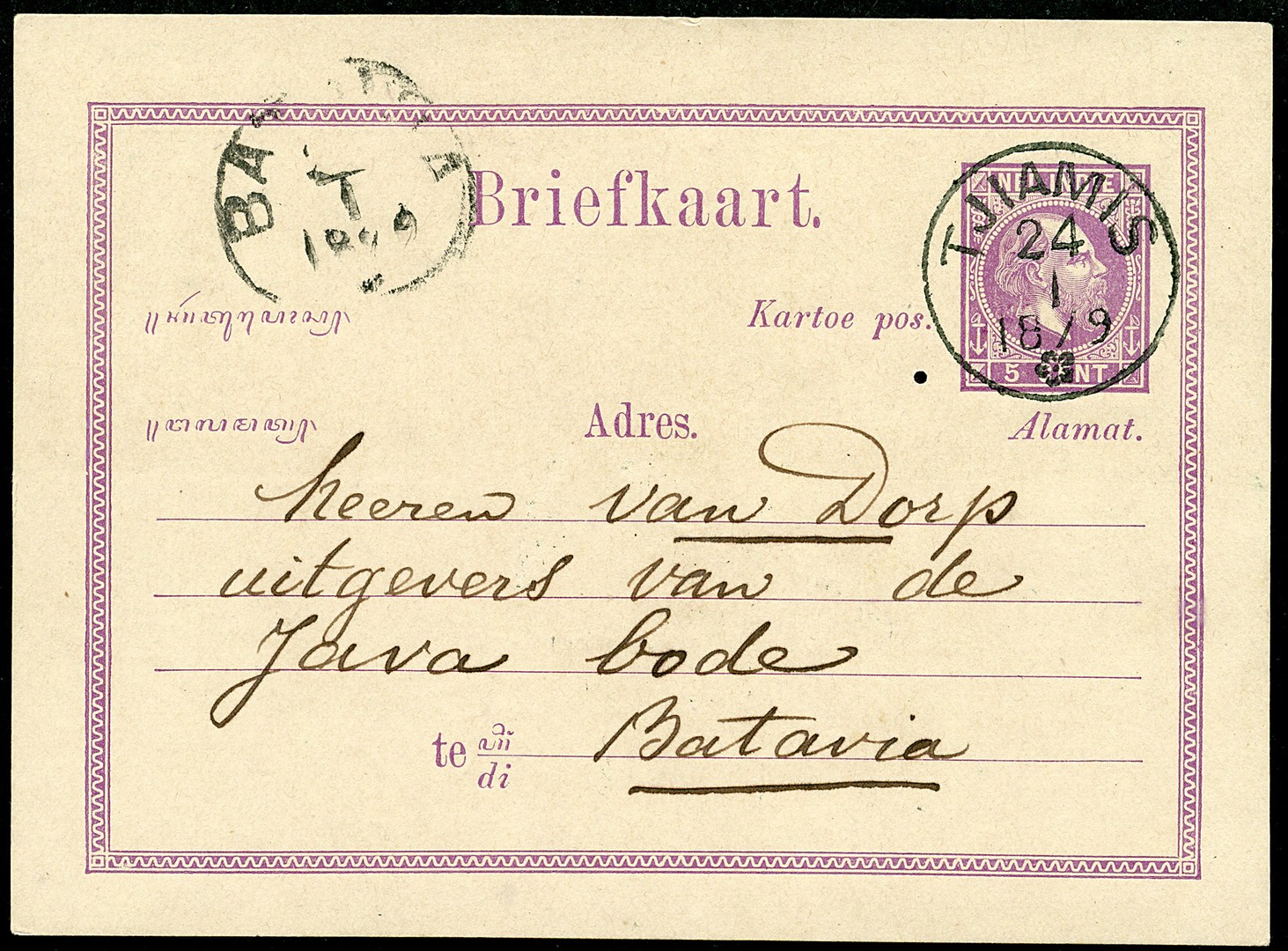 Superbe afst. rondstempel met rozet van TJIAMIS 24-1-1879 op bk. G1c over Bandong 25-1 (az.) naar Batavia (SvL 250)