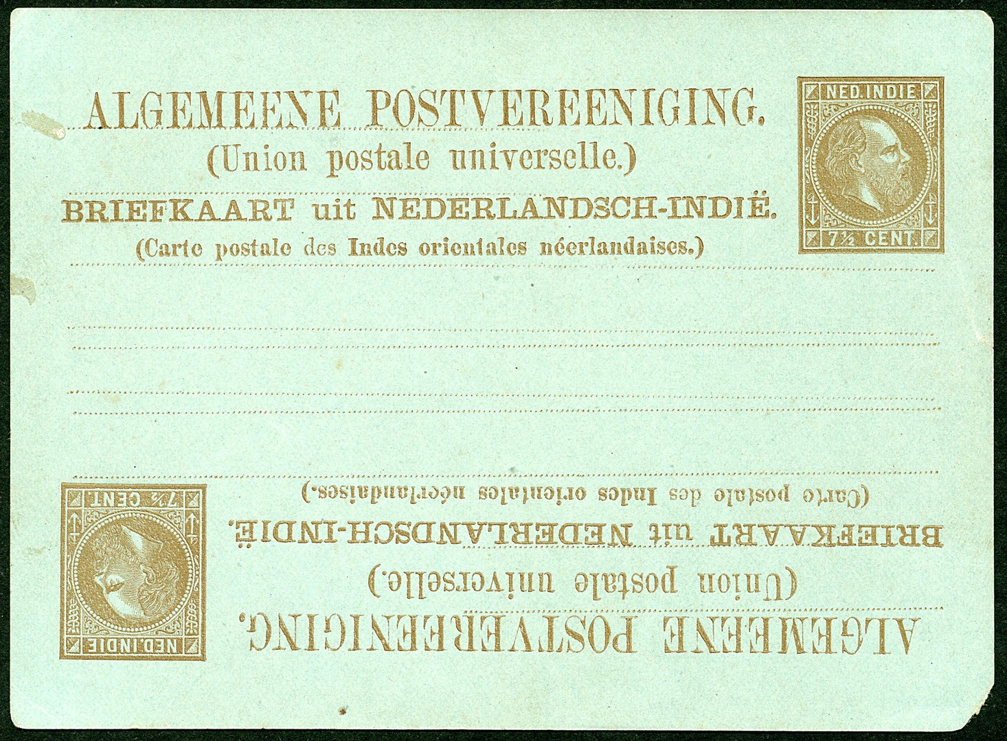 Proef van de briefkaart G5 (1879) op blauwachtig grijs karton (az. crèmekleurig) met variëteit ´Dubbel gedrukt waarvan één kopstaand´. Vrijwel prachtkaart (mist hoekje) en door ons nog niet eerder gezien