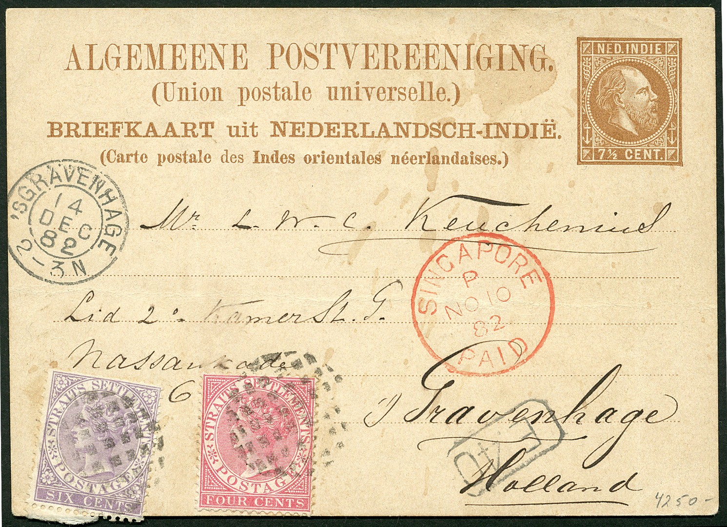 BK. G5 OP 30-10-1882 GESCHREVEN TE PALEMBANG, ONAFGESTEMPELD EN MEEGENOMEN/MEEGEGEVEN NAAR SINGAPORE, DAAR OP 10-11-1882 VOORZIEN VAN ZEGELS VAN 4C EN 6C, MET STOM PUNTSTEMPEL AFGEST. (MOGELIJK IS HET NADERE ADRES ´NASSAUKADE 6´ PAS IN SINGAPORE GESCHREVEN), VERZ. NAAR MR. L.W.C. KEUCHENIUS, LID VAN DE TWEEDE KAMER IN ´sGRAVENHAGE 14-12. ONDANKS ENKELE MINIEME GEBREKEN EEN HEEL BIJZONDER POSTSTUK!