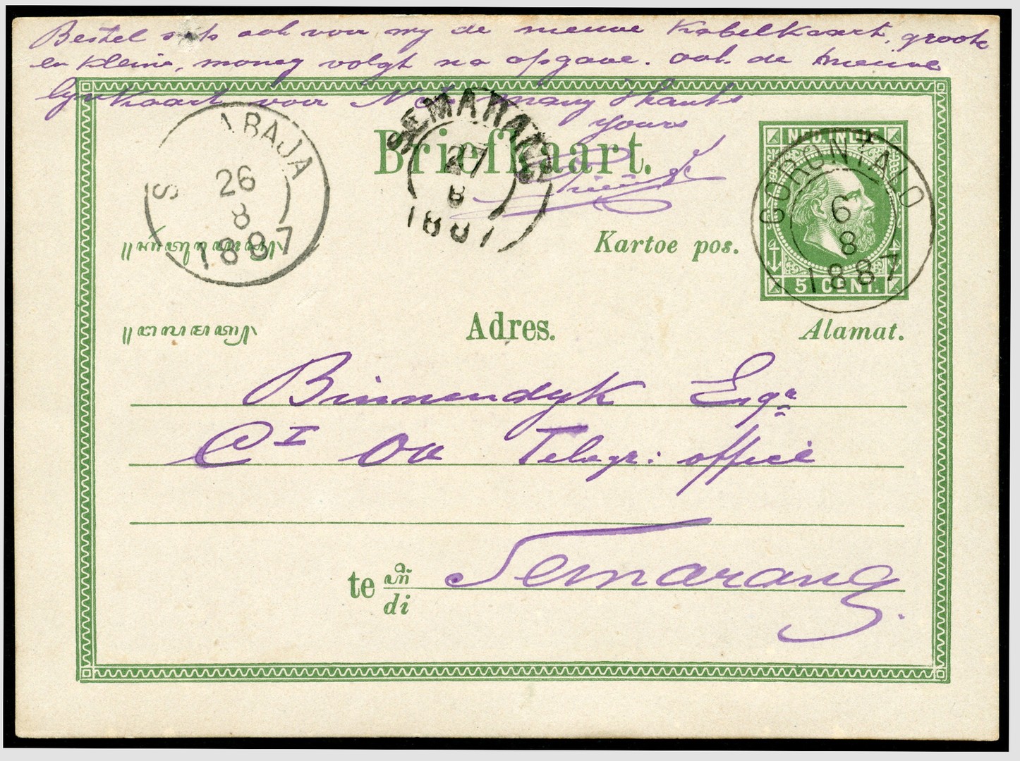 Bk. G6 met superbe afdruk van het schaarse kleinrond GORONTALO (SvL 400) op 6-8-1887 via Soerabaja naar Semarang 27-8