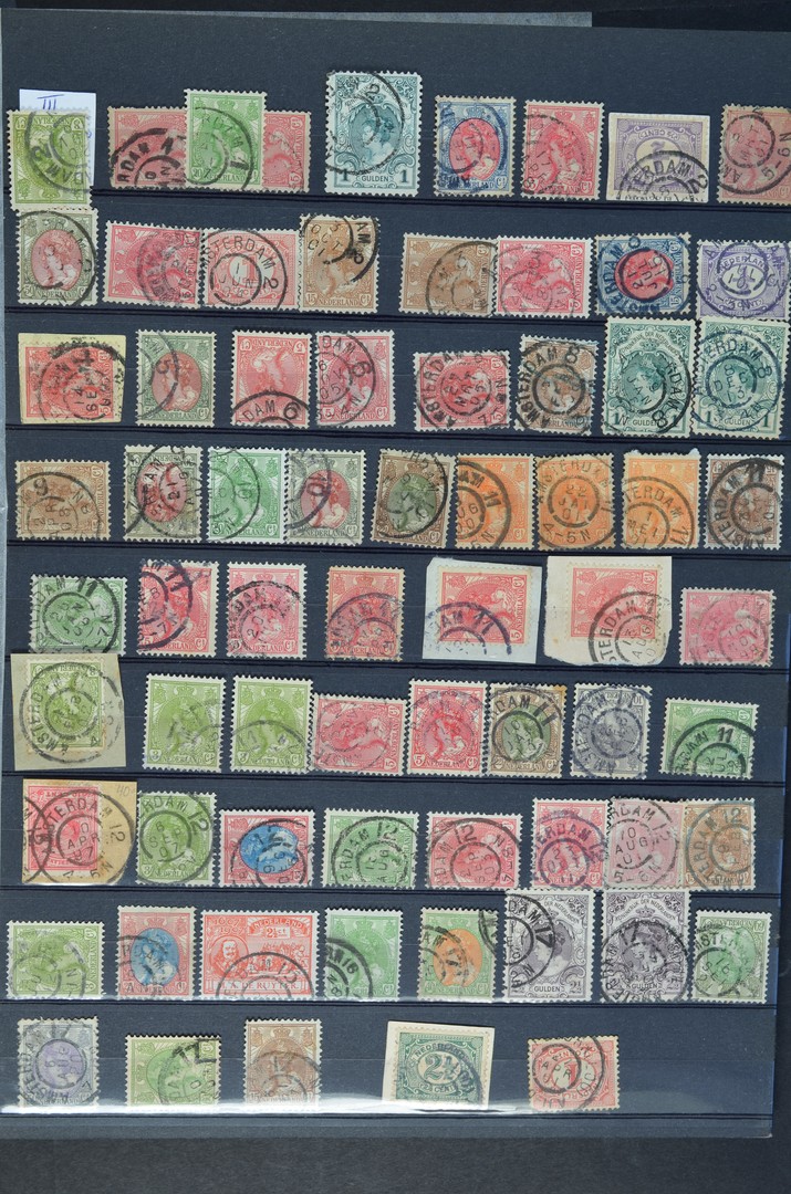GROOTRONDSTEMPELS, collectie van post-, hulppost-, bijpost- en stationskantoren alsmede trajectstempels, op losse zegels van diverse emissies en waarden, briefstukjes en knipsels, w.o. schaarse ex. en prachtige afstempelingen, op 8 insteekbladen