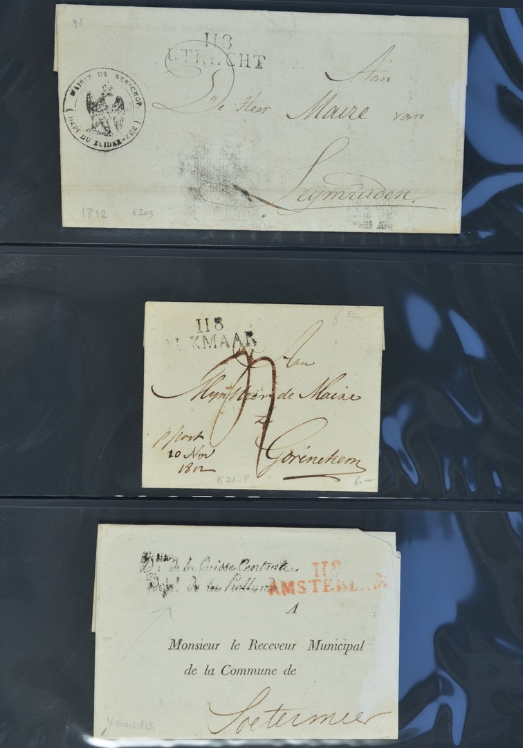 POSTHISTORIE, 8 voorfila brieven/briefomslagen, 6 met departementsstempels van Alkmaar, Amsterdam (3x), Maastricht en Utrecht, en 2 déboursé-brieven uit Amsterdam (1816, 1817)