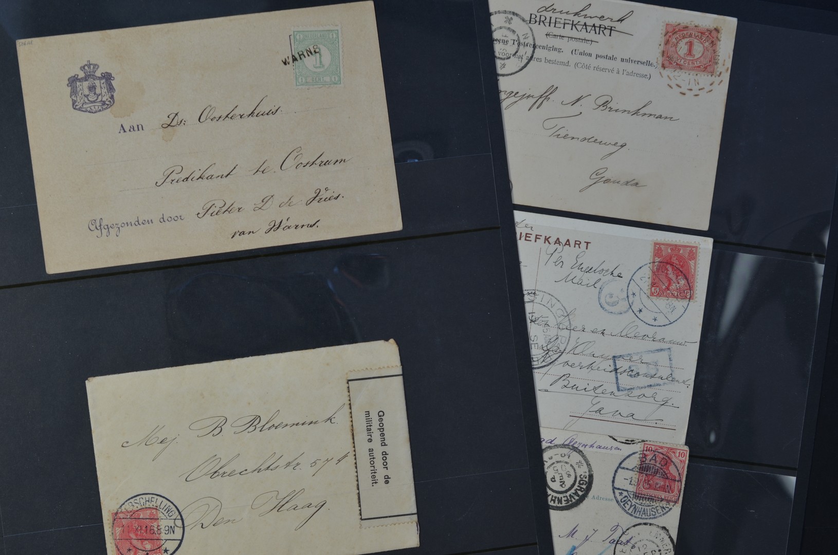 POSTHISTORIE, zeven betere poststukken ca. 1895-1918 w.o. naamstempel Warns (ca. 1895), brandstempel (9-9-1901), rebut (1905), strook ´Geopend door de/militaire autoriteit.´ (1916), etc.