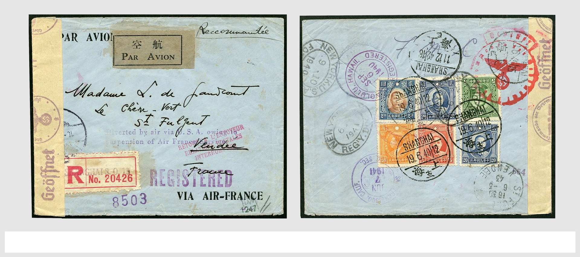 CHINA, Airmail cover bearing on the back 5c, 15c, 20c (2x), 40c and 2$ registered from Shanghai 19 June 1940 via Honolulu 6 Sep 40 and New York 10 Sep 40, censored by the Germans, to its destination St. Fulgent (Vendée) in France, however on the front showing in violet the cachet ´Diverted by air via U.S.A. owing to/suspension of Air France Service.´ and in red ´Retour à l´Envoyeur/Relations Postales/Interrompues´, via New York and San Francisco 7 June 41 back to Shanghai, on 11 Dec 42 once again sent and arrived in St. Fulgent on 6 March 43. Highly interesting and historical airmail cover!