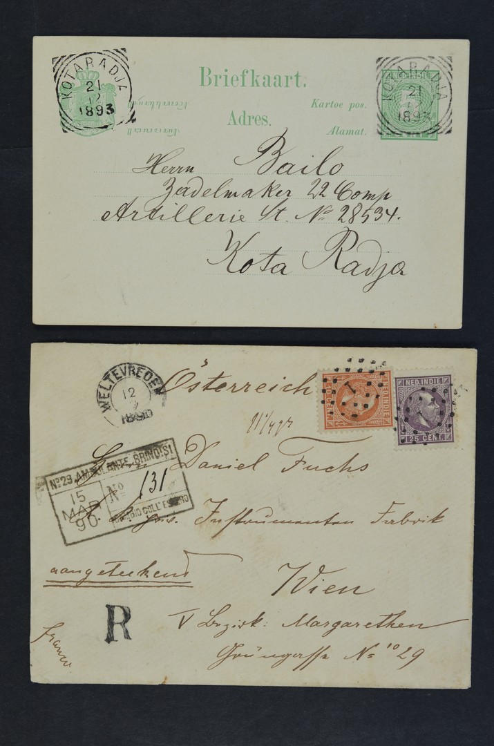 NED.- INDIË POSTHISTORIE, ruim 200 post(waarde)stukken 1875-1949 waarbij stempels, frankeringen, aangetekend, etc. in album