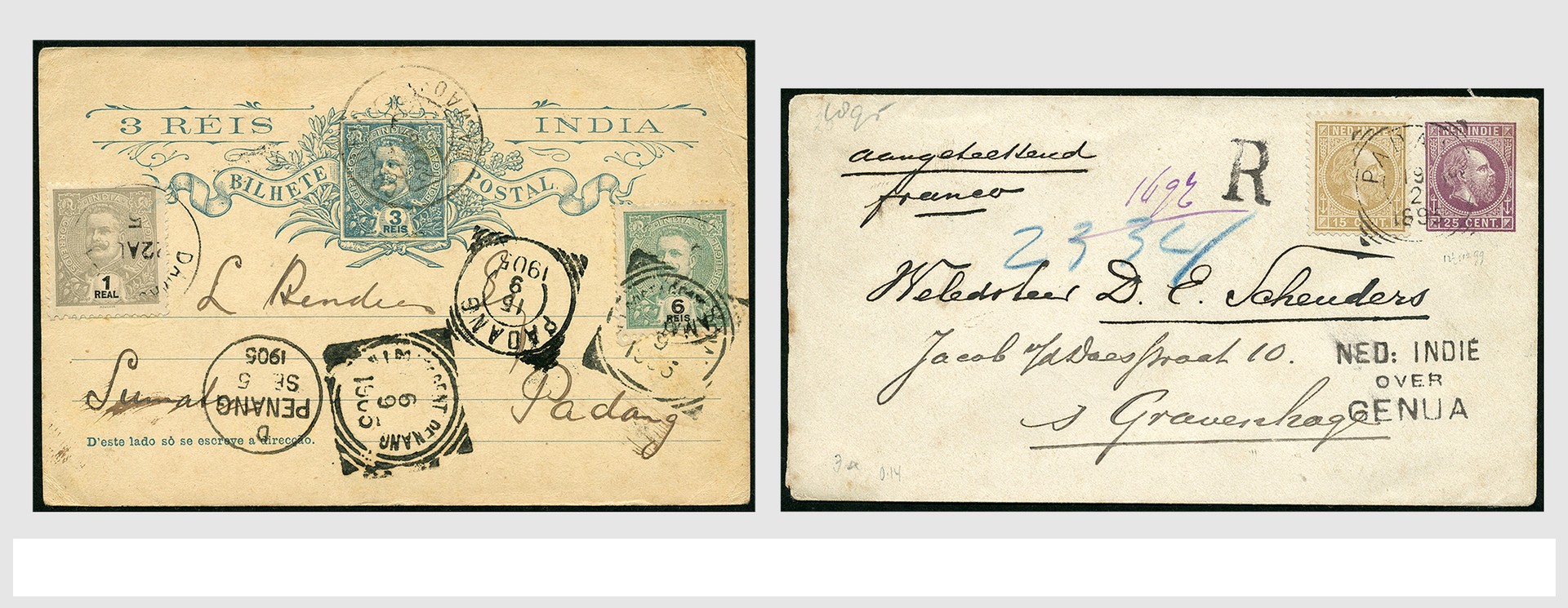 NED.- INDIË POSTHISTORIE, ruim 150 poststukken 1876-1962 vanuit en naar Indië met routestempels, scheepsstempels w.o KPM, stempels van postagenten te Singapore, Penang en aan boord van mailschepen w.o. vierkant Agent Bat:Amsterdam (1904), Ligne N, diverse typen Batavia/Mail, zeesorteerkantoren Padang/Batavia en Singapore/Batavia, etc. in album
