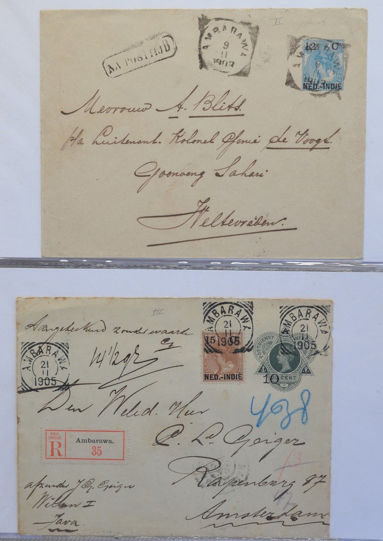 NED.- INDIË POSTHISTORIE, ca. 165 poststukken met vierkantstempels w.o. betere als Tebingtinggi-Palembang, veel mooie afstempelingen, aangetekend, bestemmingen, etc. in album
