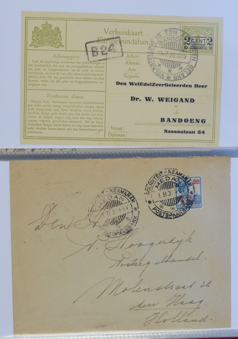 NED.- INDIË POSTHISTORIE, ruim 110 poststukken 1914-1940 met gelegenheidsstempels, propagandastempels, machinale stempels met reclamevlaggen, NEO- en NEW-trein, bedrukte postwaardestukken, RK 1915, etc. in album