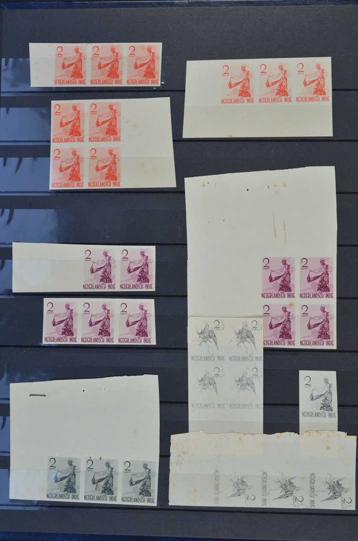 NED.- INDIË, Inheemse dansers 1941, uitgebreide collectie ongetande en ongegomde kleurproeven in de waarden 1c (niet uitgegeven), 2c, 2½c, 3c, 3½c (niet uitgegeven), 4c, 5c en 7½c in verschillende kleuren van donkere naar lichte intensiteit, met of zonder zichtbare achtergrondbedrukking, in grote en kleine veldelen, losse zegels, op sommige velranden notities voor de drukker, etc. in insteekboek