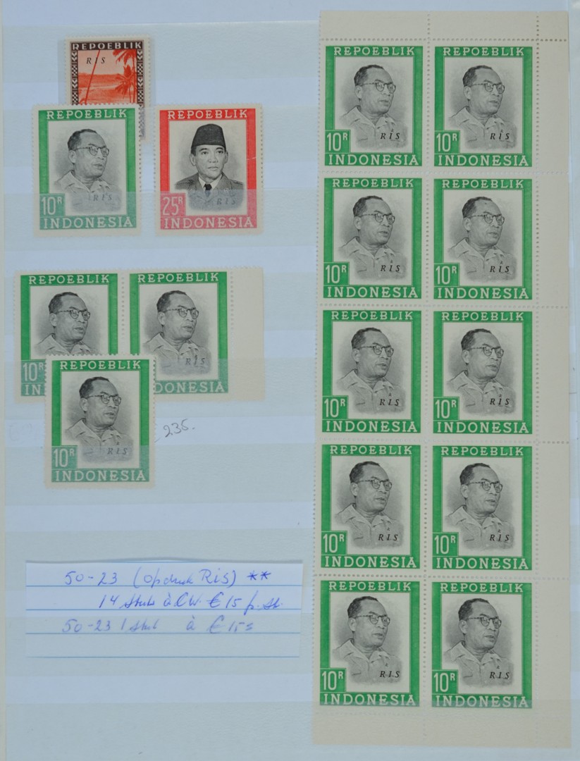 REPUBLIEK INDONESIA 1945-1949, two stockbooks filled with stamps without and with overprints, perforated and unperforated, souvenir sheets and complete sheets overprinted Republik Indonesia Serikat. The cat. value is according to the vendor well above € 10.000