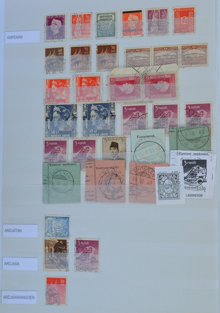 INDONESIË POSTHISTORIE, twee insteekboeken waarin uitgebreide collectie langebalkstempels, merendeels 1949-1959, van A t/m W op losse zegels, briefstukjes en knipsels, w.o. stempels uit de Nederlands-Indische tijd, kleine bij- en hulppostkantoren, langebalk met nummer, nieuwe en/of gewijzigde kantoornamen, etc. en tevens wat poststukken. Maar weinig aangeboden en zeker niet in deze omvang