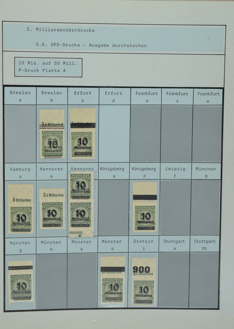 DUITSE RIJK 1923, gespecialiseerde verzameling 'OPD-Drucke der Milliardenüberdrucke' getand en doorstoken zegels postfris, meest met bovenvelranden, met veel kennis van zaken opgezet op Safe bladen in ringband