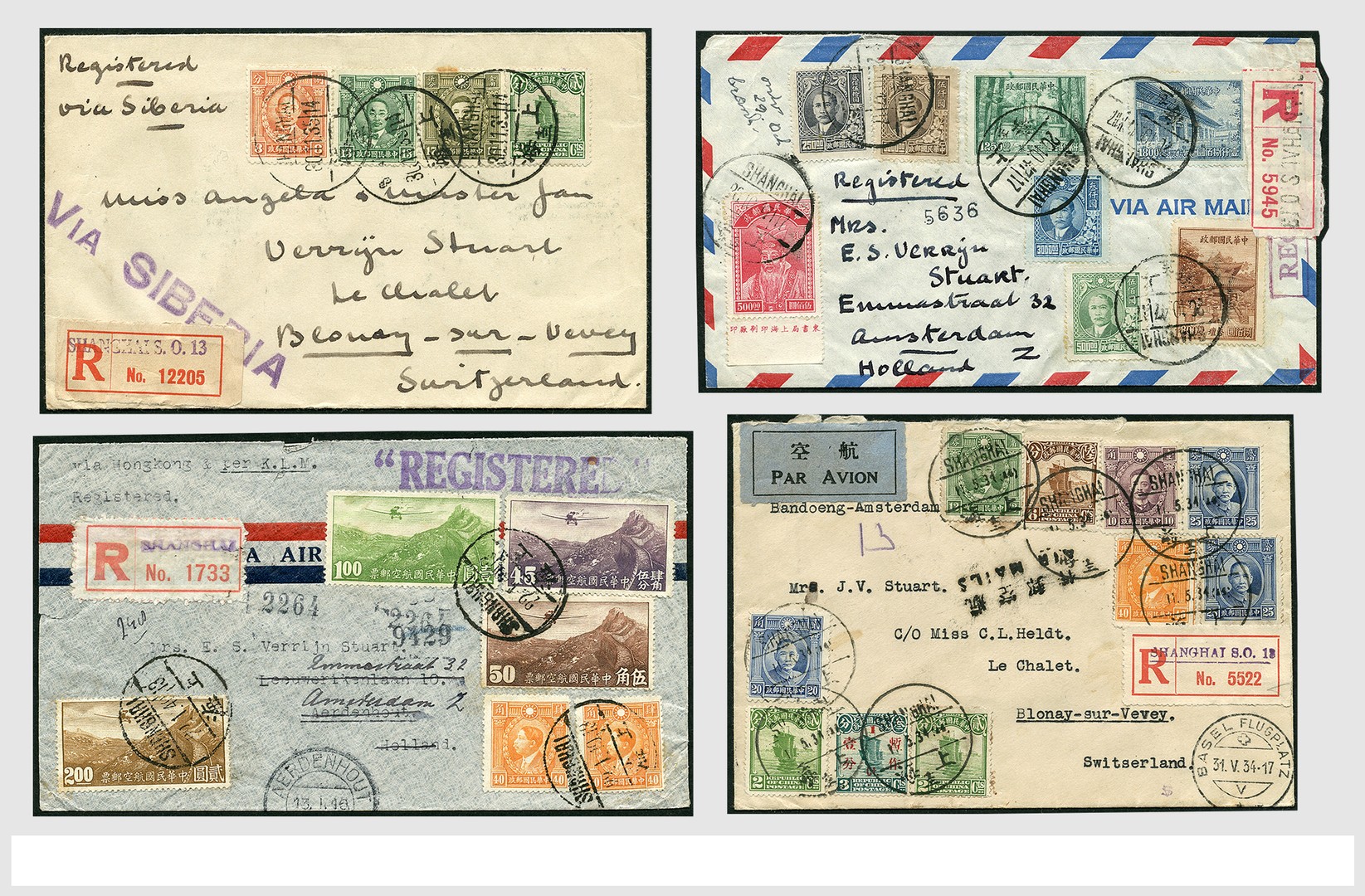 CHINA, nice collection of 50 registered covers, mostly the 1930s and 1940s from Shanghai by airmail to the Netherlands and a few to England and Switzerland, showing a wide variety of colourful frankings, all from an authentic correspondence, housed in an album