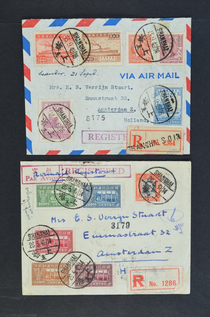 CHINA, special collection of 51 covers of which 21 are registrated, mostly the 1930s and 1940s from Shanghai by airmail to the Netherlands, some to Switzerland and some locally sent in Shanghai, showing a wide variety of colourful frankings, all from an authentic correspondence, housed in an album
