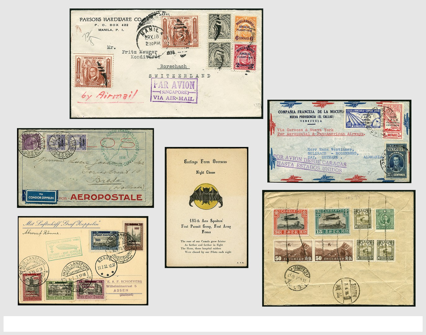 MOTIEF: Luchtpost, Vliegtuigen, enorme verzameling Luchtpostcovers, 1e vluchten waarbij Nederlands Indië-route, postwaardestukken, fotokaarten, etc., in 34 banden/albums. Laat deze prachtkoop niet aan u 'voorbijvliegen', in 3 verhuisdozen