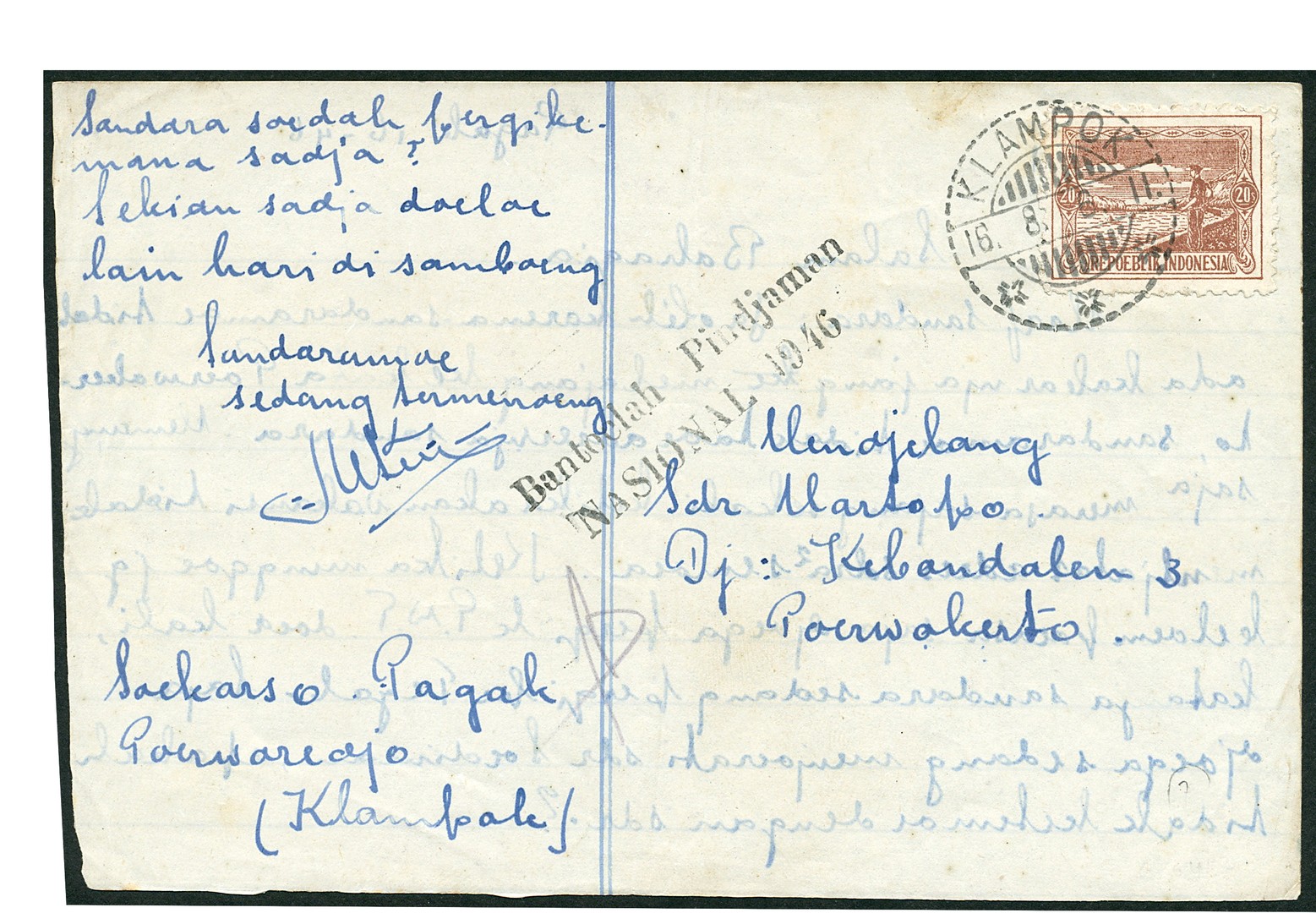 Republik. Java. Propaganda cachet. Two-line ´Bantoelah Pindjaman/NASIONAL 1946´ (vNV.483) on home-made postcard bearing 20s no. 026 from Klampok 16.8.6. to Poerwokerto