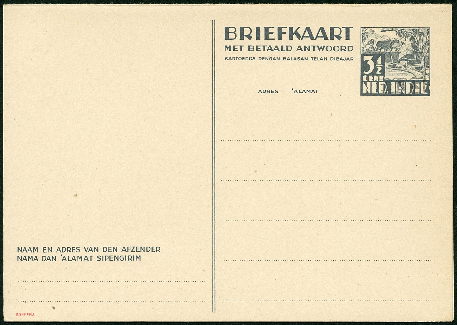 Sumatra. East Coast. 3½ Cent postcard with reply-paid card attached not in offset but in rotogravure print (by Joh. Enschede & Sons, Haarlem), with black Dai Ni Hon overprint in a wavy frame type 832, unused. Signed Boekema. Very rare card!