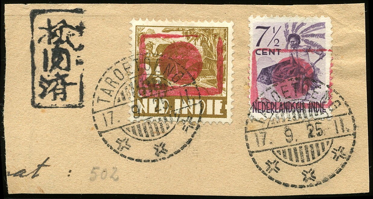 Sumatra. Tapanoeli. 2½ Cent Kreisler and 7½ cent Dancer both with Hinomaru overprint nos. 221r-17b and 211p-71, on piece cancelled Taroetoeng 17.9.25 with censor Bu.JC13a. € 60