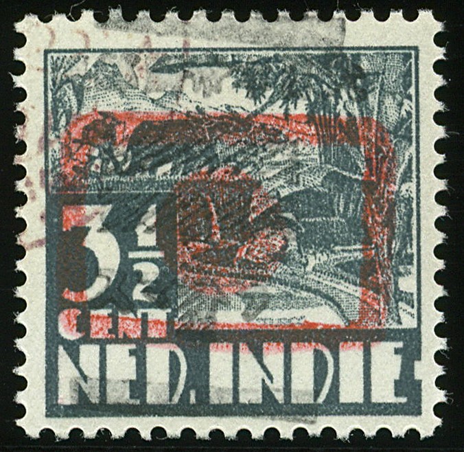 Sumatra. Tapanoeli. Handstamped T-overprint in combination with Hinomaru overprint on 3½ cent Kreisler no. 918z/221r-19a (signed Boekema), 25 cent Van Konijnenburg no. 912z/221p-47 and 2 gulden Van Konijnenburg no. 912z/221p-55g, all cancelled. € 410