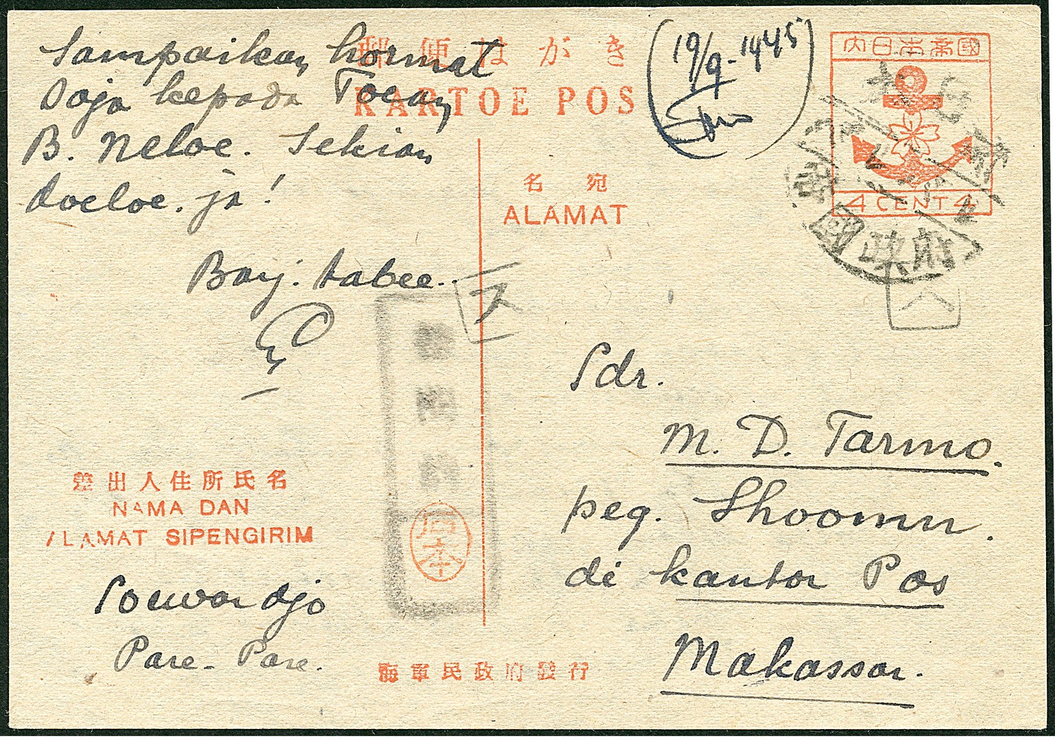 South Celebes. 4 Cent postcard Bu.283a (general issue) written in Pare Pare on 20-9-5, to Makasser. Censor Vr.201. Ex Mattern