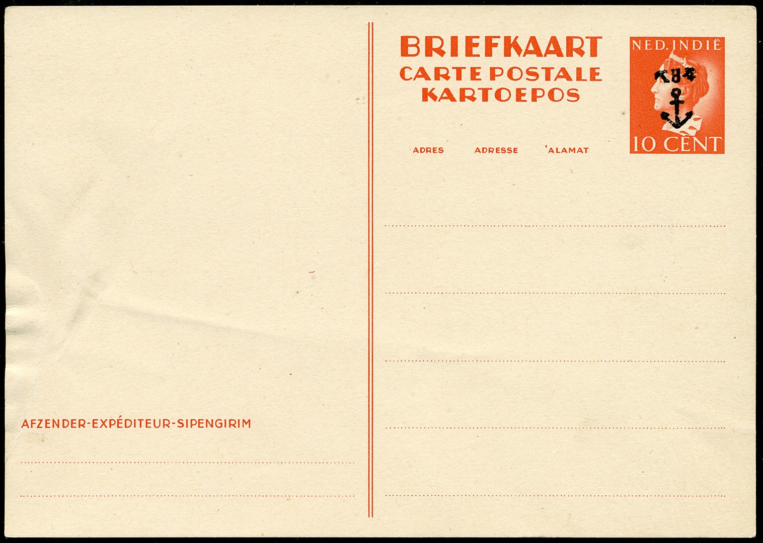 South Celebes. 10 Cent Van Konijnenburg postcard with black Makasser anchor overprint type 112z Bu.238, unused (paper slightly damaged on the left)
