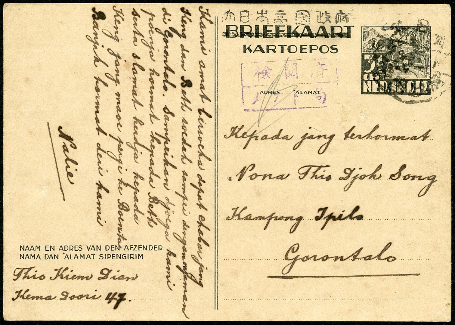 North Celebes. 3½ Cent postcard with black anchor overprint and 7 characters without frame Bu.245a written in Menado 15-6-2603 to Gorontalo. Censor Bu.JC3a. Rare postcard!