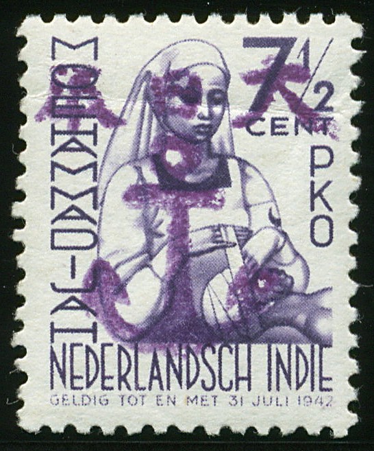 West Borneo. Moehammadijah 2, 3½, 7½ and 15 cent with violet large Pontianak anchor overprint nos. 410v-61/63, 65, unused (10 cent unused not recorded). Signed Boekema. € 180