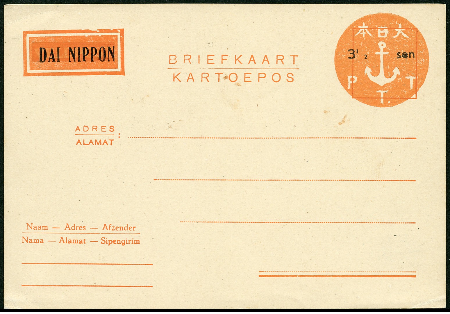 West Borneo. Netherlands Indies field postcard overprinted for usage with black DAI NIPPON and 3½ sen and orange P.T.T. and anchor with Dai Ni Hon, Bu.228, unused. See: Fred J. Nash, table p.173