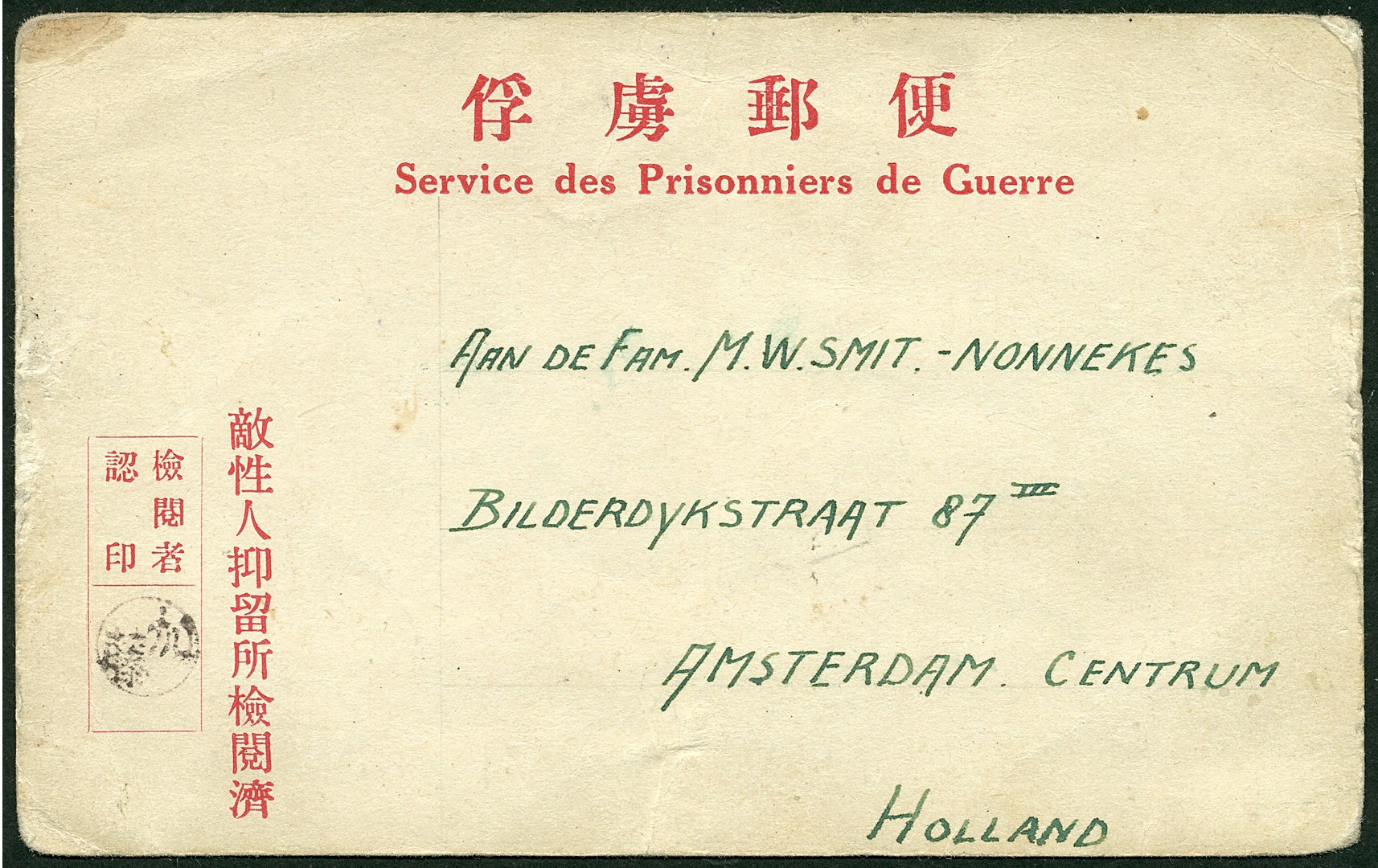 POW. Netherlands Indies. Sumatra. POW card Bu.PW7 written in the Civilian Internment Camp voor Men in Palembang on 14 March 1943, with a long interesting family and situation message in Dutch language (obviously allowed in this camp), sent to Amsterdam with on the back a note that the card was received on 15 Sep. No German censor mark. Very rare card (Bu. RRR)