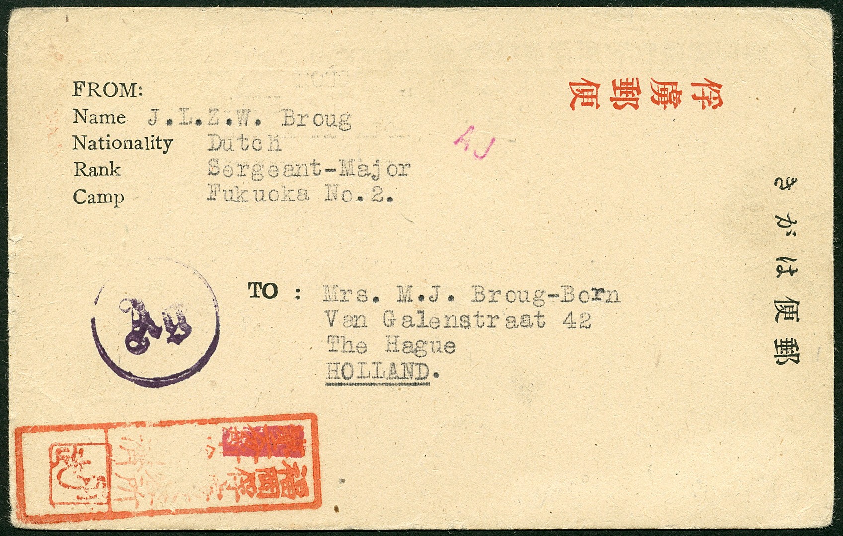 POW. Netherlands Indies. Japan. POW card Bu.PW26 from a Dutchman in the Japanese Fukuoka camp No. 2 to his parents in The Hague, with Japanese and German censors