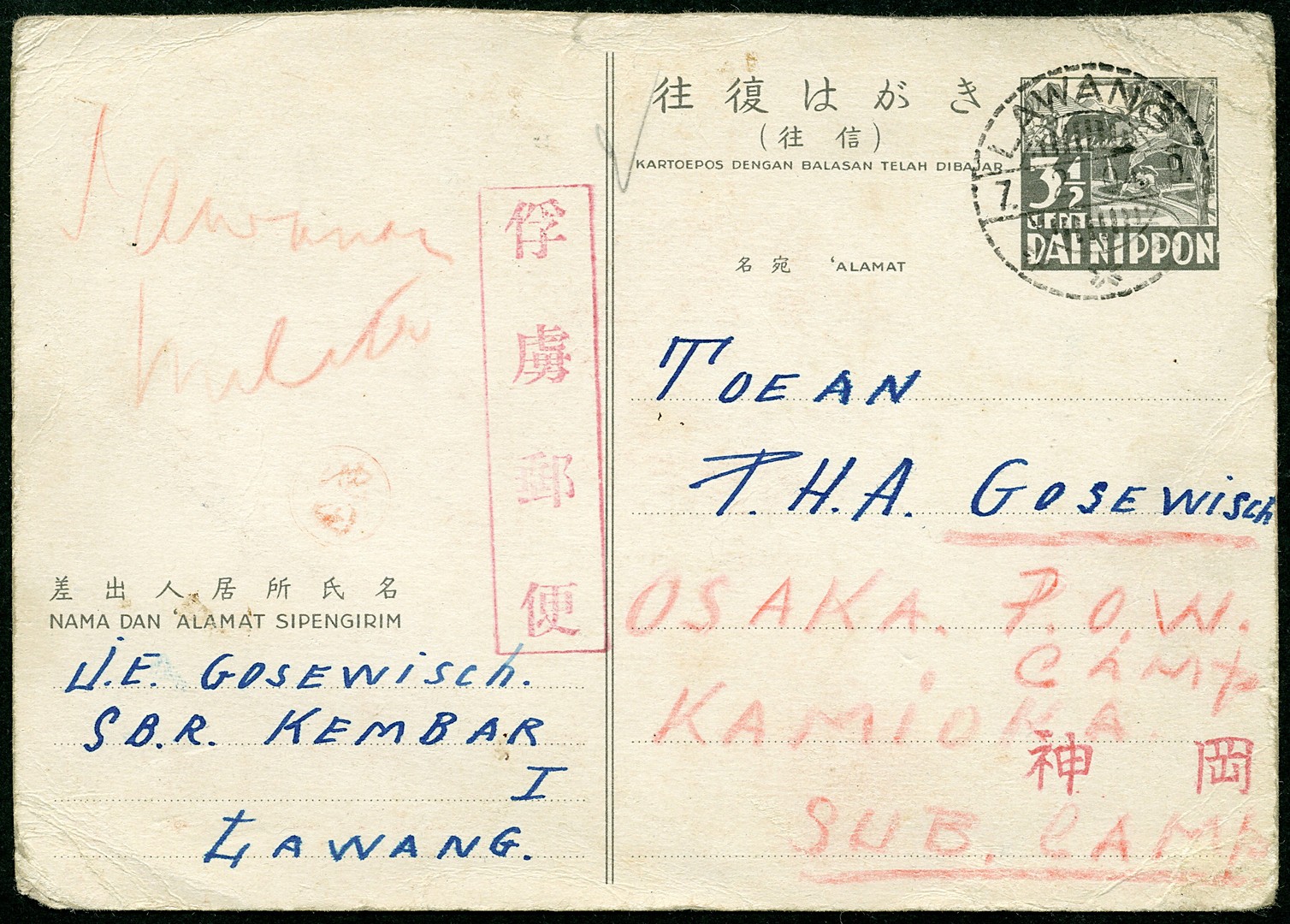 POW. Netherlands Indies. 3½ Cent postcard Bu.4 (outward card) from Lawang 7.2.04 to a husband in the Kamioka POW camp near Osaka