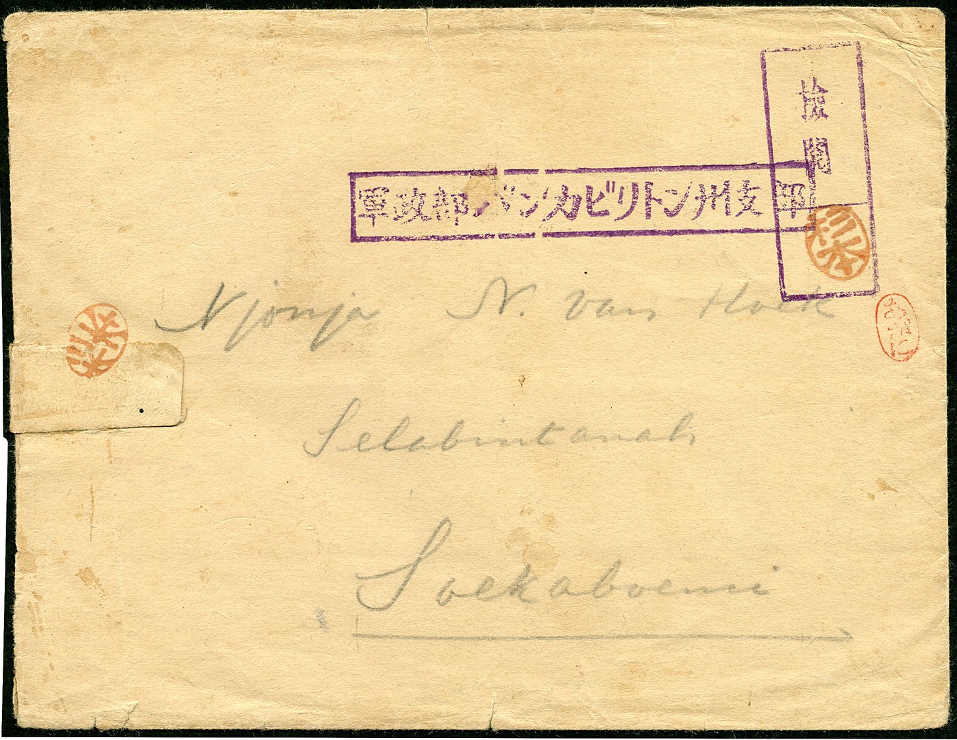 POW. Netherlands Indies. Envelope from the island of Banka, Sumatra, to a lady in Selabintanah in Soekaboemi, Java. Censor Bu.JC12b from Pangkal Pinang. According to Dr. Norman Jacobs the other cancel is an inward handstamp for Sumatra. Jacobs NS11 & NS12