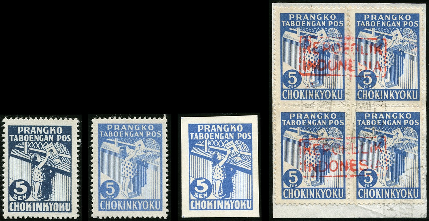 Republik. Java. 5 Sen Savings-bank stamp (printed by G. Kolff & Co., issued in 1944), in block of four on a piece of an envelope, with handstamped two-line overprint REPOEBLIK/INDONESIA type 52 in red, used as a postage stamp and cancelled Djakarta 4.6.46. Also three proofs in different designs, different shades of blue, ungummed (see: Handbook of Revenues, Dai Nippon, p. 407, JJD-19). Very rare