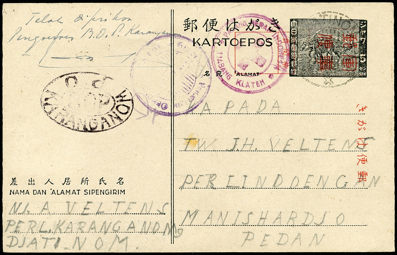 Republik. Java. 5 Sen postcard Bu.RJ.N6 from a prisoner camp at Djatinom on 4.46 through the Indonesian Red Cross at Klaten to a family member in another prisoner camp at Pedan, showing still unidentified violet cachet and black oval cachet ´P O KARANGANOM / BOP´ (Karanganom is a village near Klaten)