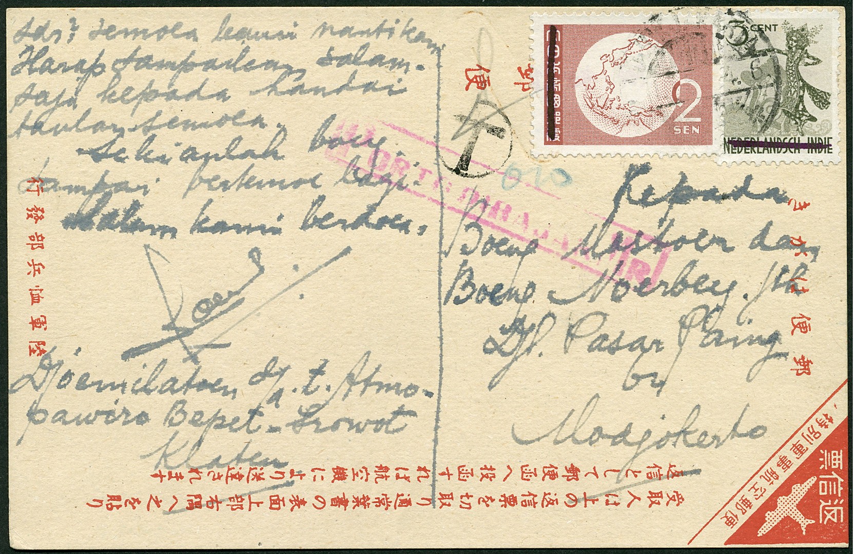 Republik. Java. Japanese field postcard for the Air Force with insufficient additional franking of 2 sen Globe and 3 cent Dancer, both with pencil line through former country name, cancelled Djokjakarta 11.5.46 to Modjokerto, at arrival cancelled in pink ´Porto dibajar Mr´ from Modjokerto, and written ´0.10´