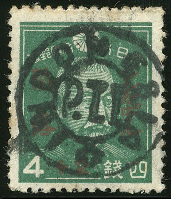 Republik. North Sumatra. Handstamped overprint INDONESIA P.T.T. between two circles, large type 221 (21 mm diameter) in black, on red overprinted Japanese stamp of 4 sen of Admiral Togo to commemorate the fall of Singapore, no. 221z-J21, unused. A rare stamp!