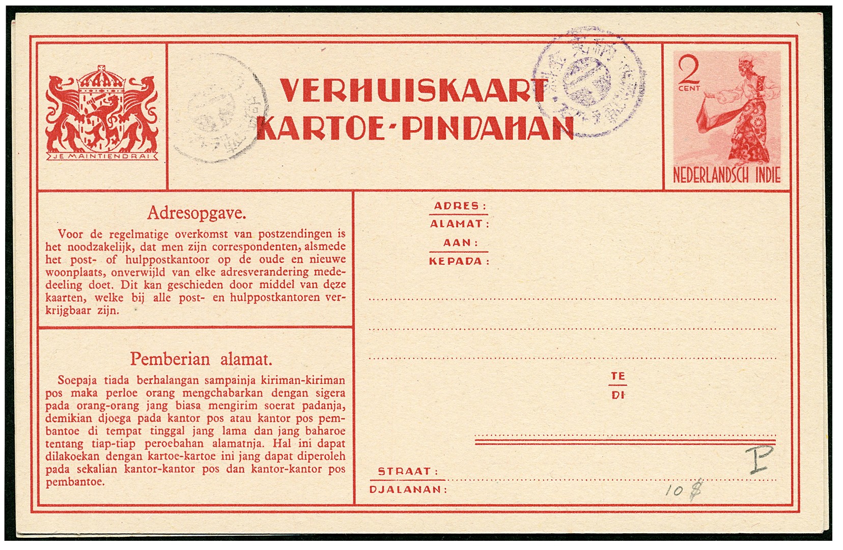 Republik. North Sumatra. Three 2 cent change of address cards type Dancer each with two postage paid marks, one without further overprints, one with black Dai Ni Hon overprint and one with black framed Dai Ni Hon overprint type 832
