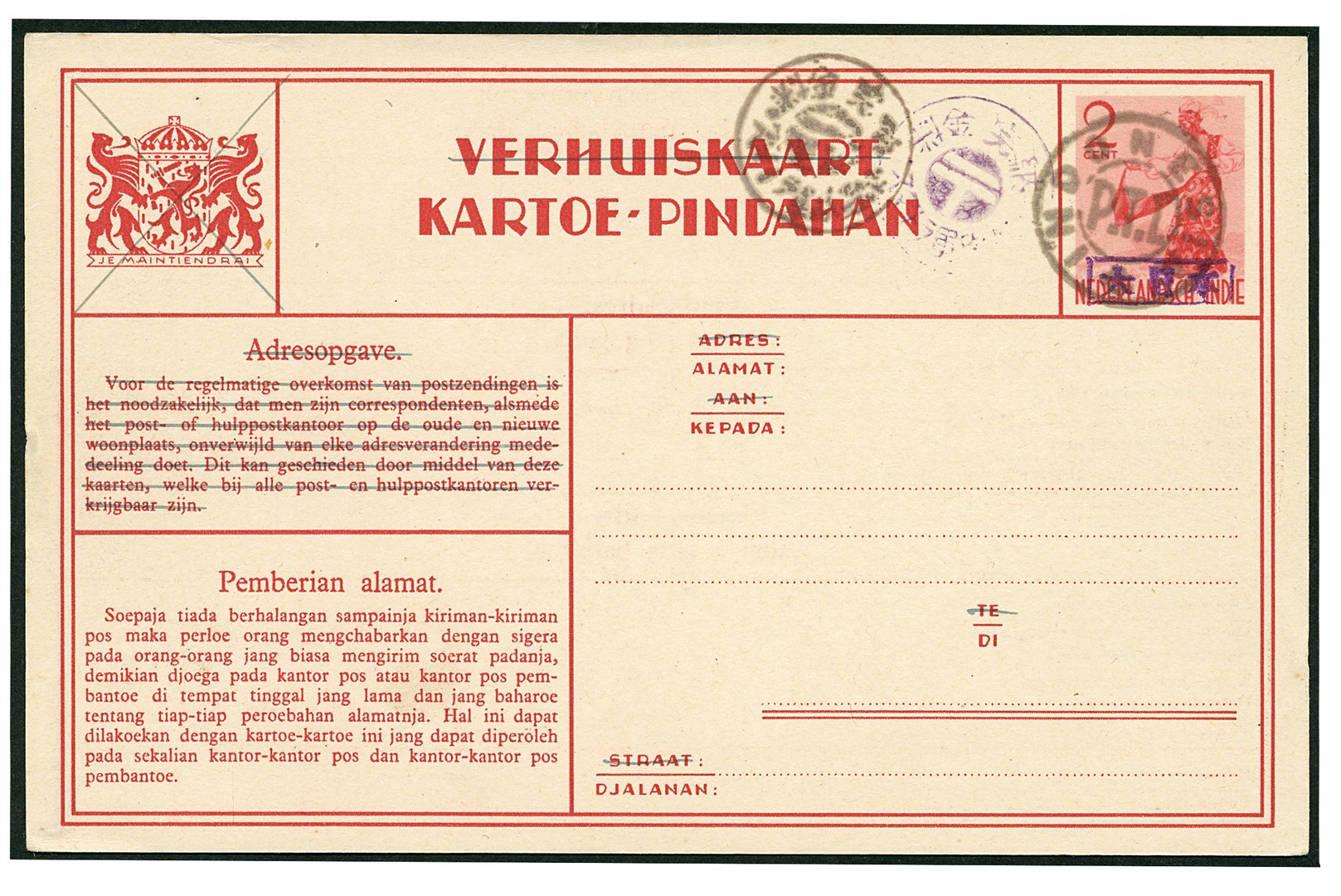 Republik. North Sumatra. Change of address card type Dancer with black framed Dai Ni Hon overprint, INDONESIA P.T.T. between circles type 221z and black and violet T-overprint Bu.RS24, unused