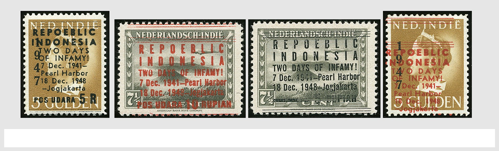 NED.- INDIË INFAMY, kleine verzameling van 11 gewone en 40 luchtpost-opdrukken, waarvan diverse opdrukken niet zijn gecatalogiseerd maar wel echt zijn (enkele ex. dunne plek, vouw, diverse doubletten), aangegeven bij het kavel. Small collection of 11 regular and 40 airmail overprints of which several overprints are not listed but are definitely genuine (some with crease, thin spot, few duplicates), mentioned in the lot