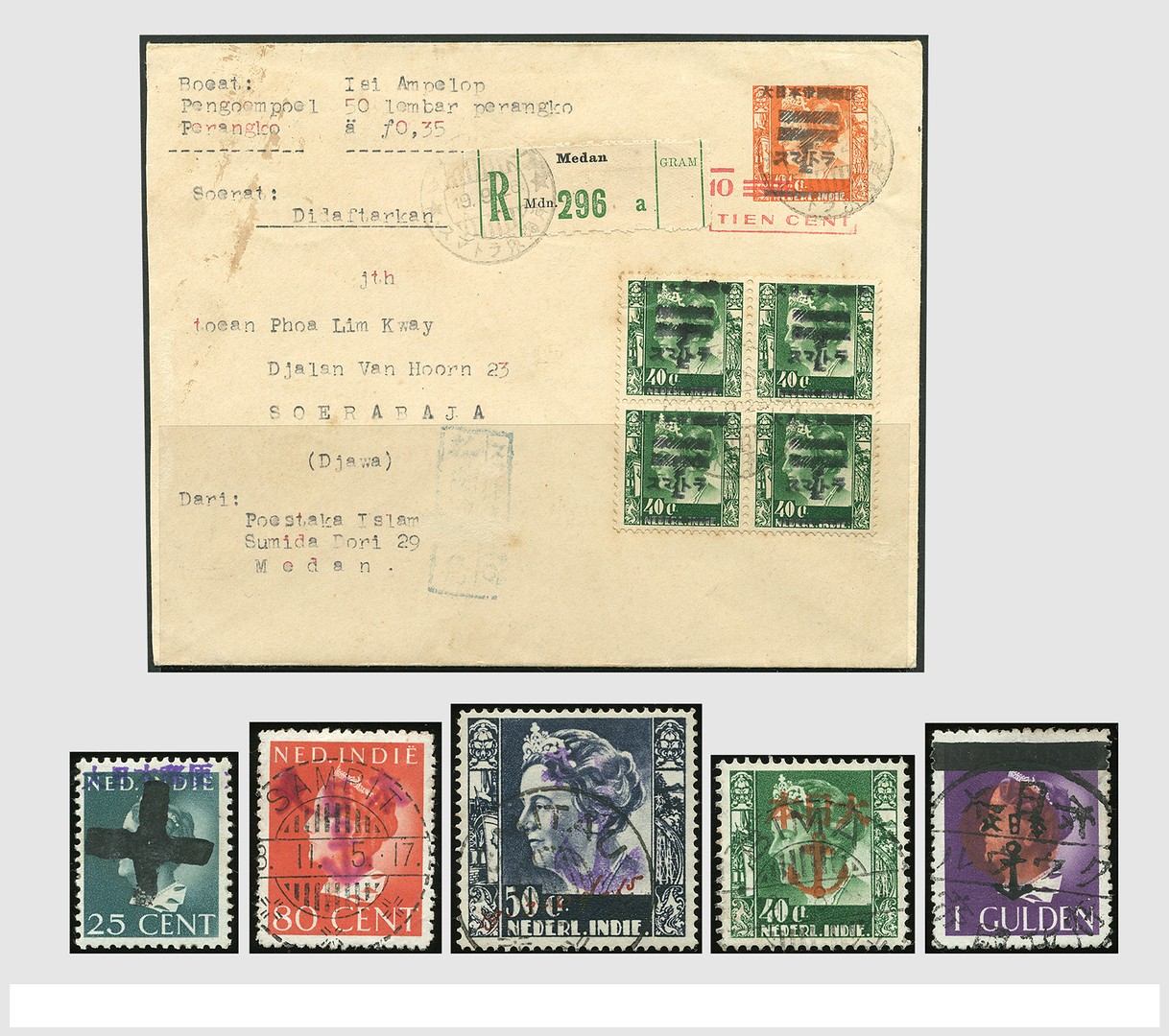 JAPANESE OCCUPATION 1942-1945 of Java, Sumatra and BGO, single used and unused stamps showing a nice variety of overprints, including better ones, some in quantities and blocks, few on piece, some nice cancellations and almost 100 covers/cards (used/unused, some 60 from Java, most others from Sumatra including a few money orders and philatelically franked envelopes), all housed in a Leuchtturm album
