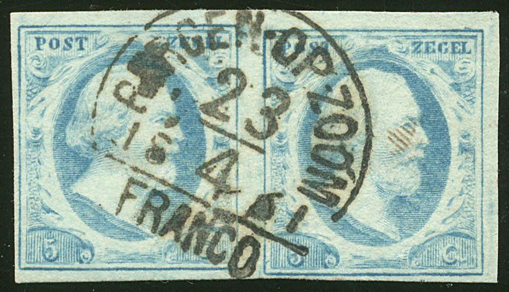 BERGEN-OP-ZOOM C klein (EY.250) op 5 cent nr. 1n-Pl.IV-31/32. Normaal tot breed gerand prachtpaar met volledige, centrale afst. met late datum 23-4-1861