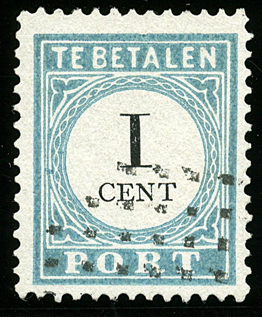Zogenoemd stom (ook wel blind) puntstempel bestaande uit kleine punten op 1 cent port P3DIII. Prachtex. met duidelijke afst. lijkend op type 3. Zie: Jans, blz. 514