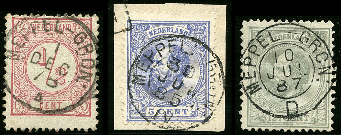 MEPPEL-GRON: op ½ cent nr. 30, MEPPEL:-GRON: op 5 cent nr. 19 en MEPPEL -GRON: op 12½ cent nr. 22. Vrijwel prachtex. met ideale afst. (½ en 5 cent) resp. prachtex. met superbe afst. (12½ cent)