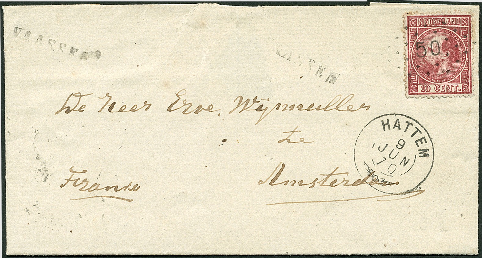 50 = HATTEM. 10 Cent nr. 8IIE (prachtex.) afgest. met puntstempel 50 op briefomslag van het hulppostkantoor Vaassen (2x naamstempel met schreefletters) over Hattem 9-6-1870 (takje) naar Amsterdam ?-6-1870. Schitterende afstempelingen van Hattem!