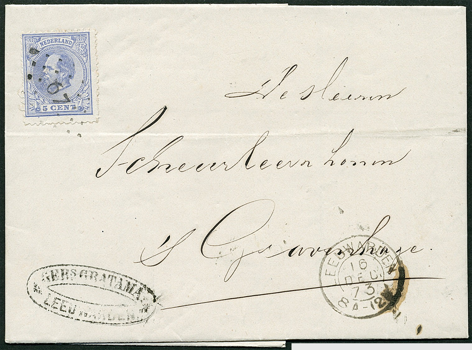 67 = LEEUWARDEN. 5 Cent nr. 19D (prachtex. en als gebruikelijk wat onregelmatig getand) afgest. met puntstempel 67 zonder krul op cpl. brief van Leeuwarden 16-12-1873 (tweeletter) naar een bankier te ´sGravenhage 17-12-1873. Bijzonder mooie en duidelijke afstempelingen!
