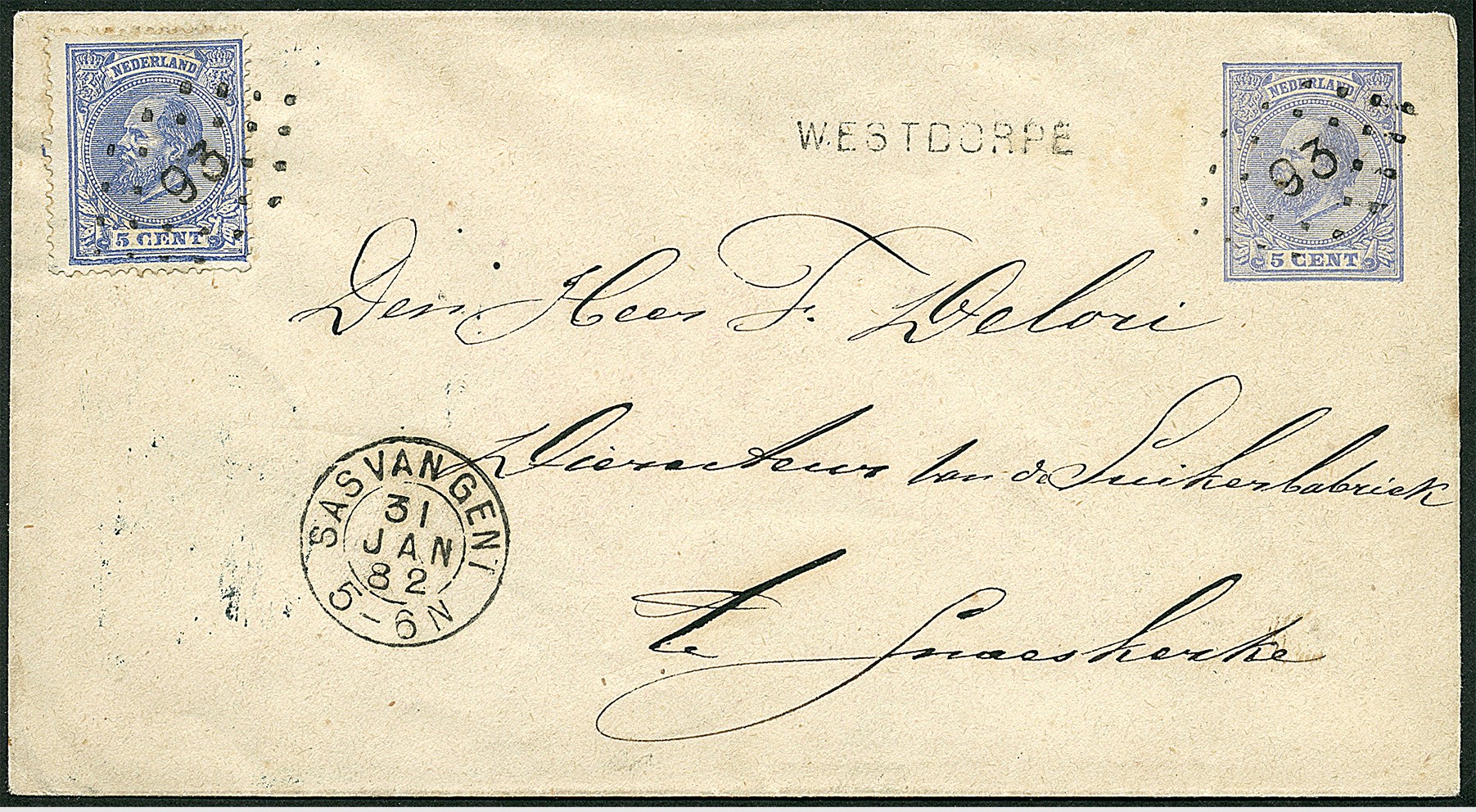 93 = SAS VAN GENT. Env. G1 bijgefr. met 5 cent nr. 19G afgest. met puntstempel 93 van het hulppostkantoor Westdorpe (naamstempel) over Sas van Gent 31-1-1882 (kleinrond) via Ghistelles (Gistel) 1-2-1882 naar Snaeskerke in West-Vlaanderen. Zeldzaam poststuk met luxe afstempelingen!