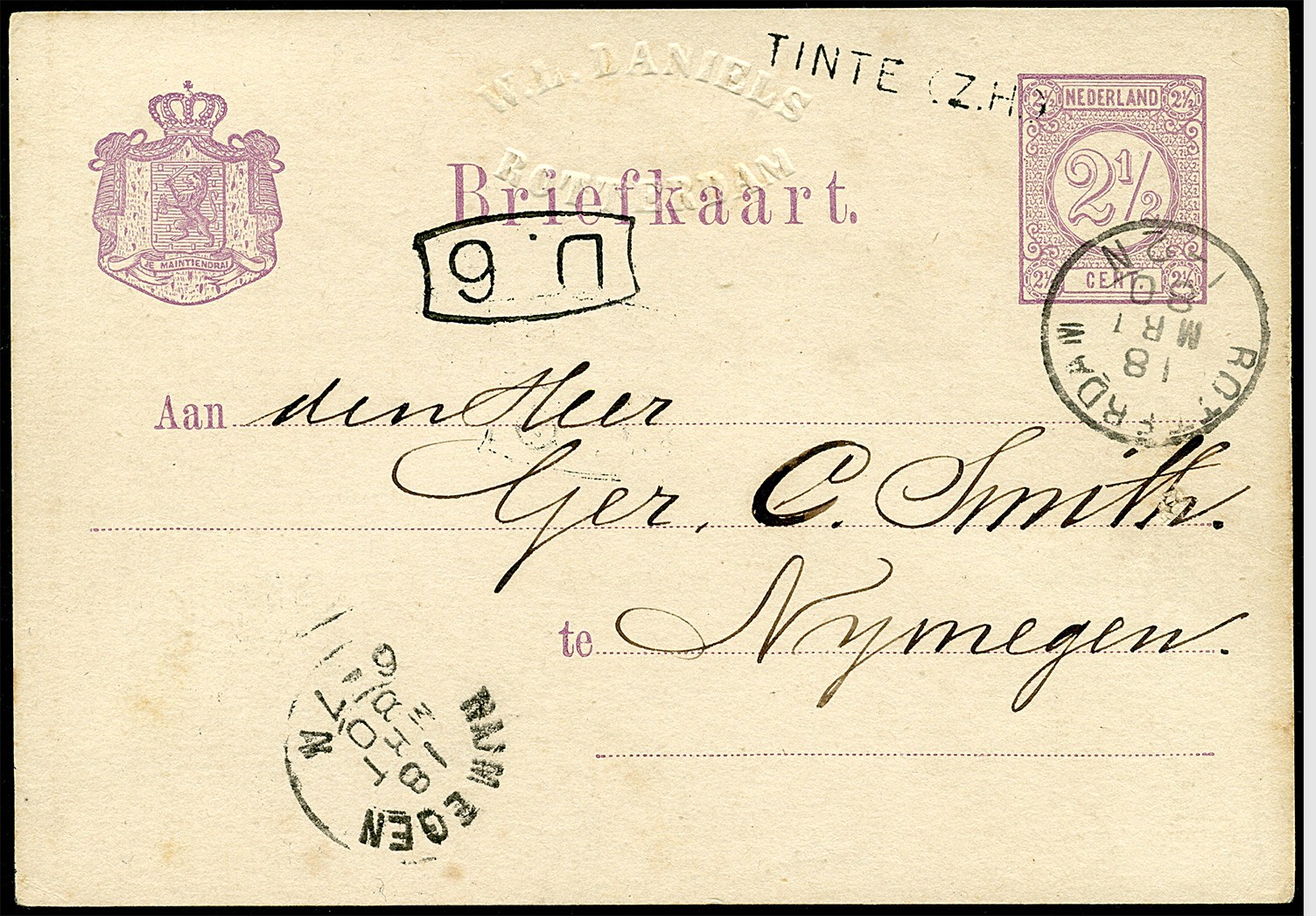 Naamstempel TINTE (Z.H.) met schreefloze letters op bk. G14 (met droogstempel van afzender) via Rotterdam 18-3-1880 naar Nijmegen 18-3-1880. TINTE (op Voorne-Putten) wordt in geen literatuur als hulppostkantoor vermeld. Cees Janssen: Tinte was vanaf 1872 bestelhuis, stempel zie KNPS 0392 (uit 1941). Rariteit en mogelijk enig bekende afstempeling op poststuk